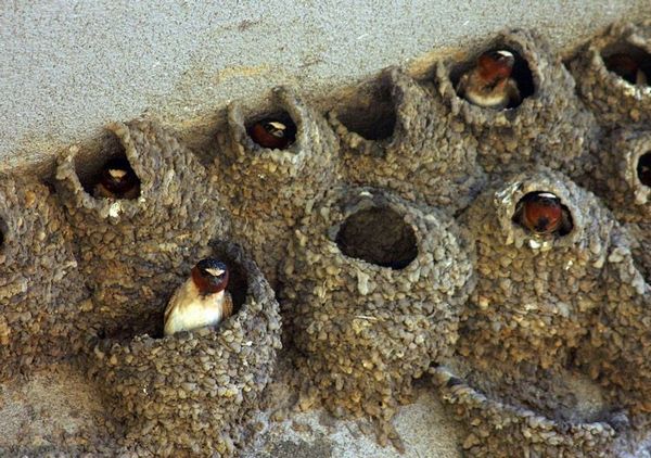 - Городские ласточки часто поселяются многочисленными колониями, включающими сотни гнезд. Многие из них расположены настолько близко друг к другу, что соприкасаются стенками. Жизнь в крупных колониях шумна и беспокойна, и владельцам гнезд приходится постоянно охранять их от захватчиков.